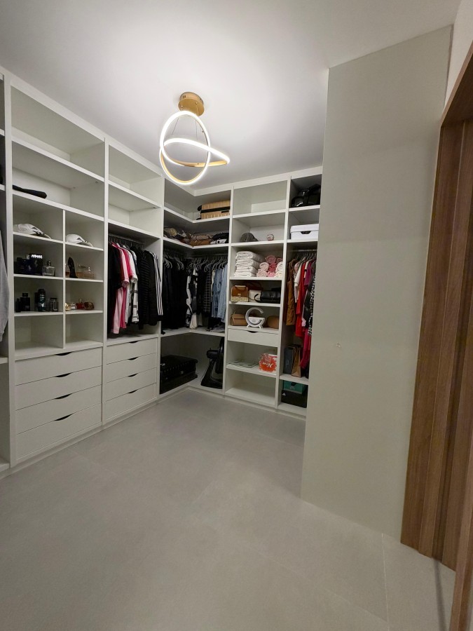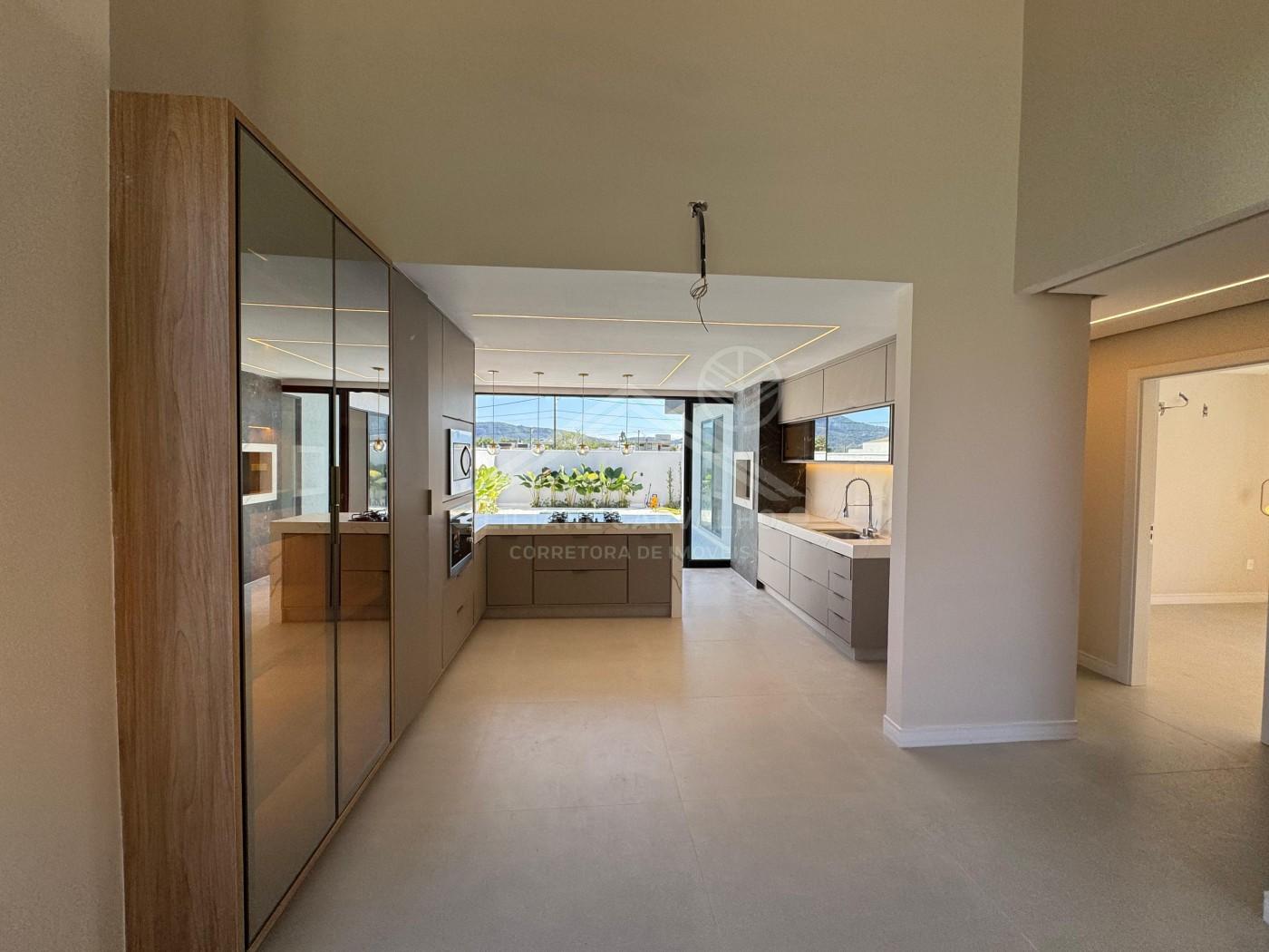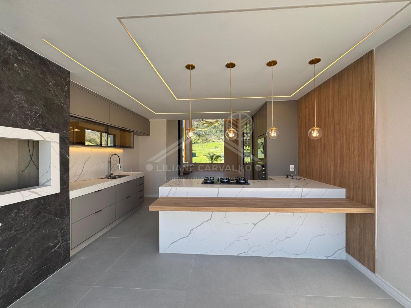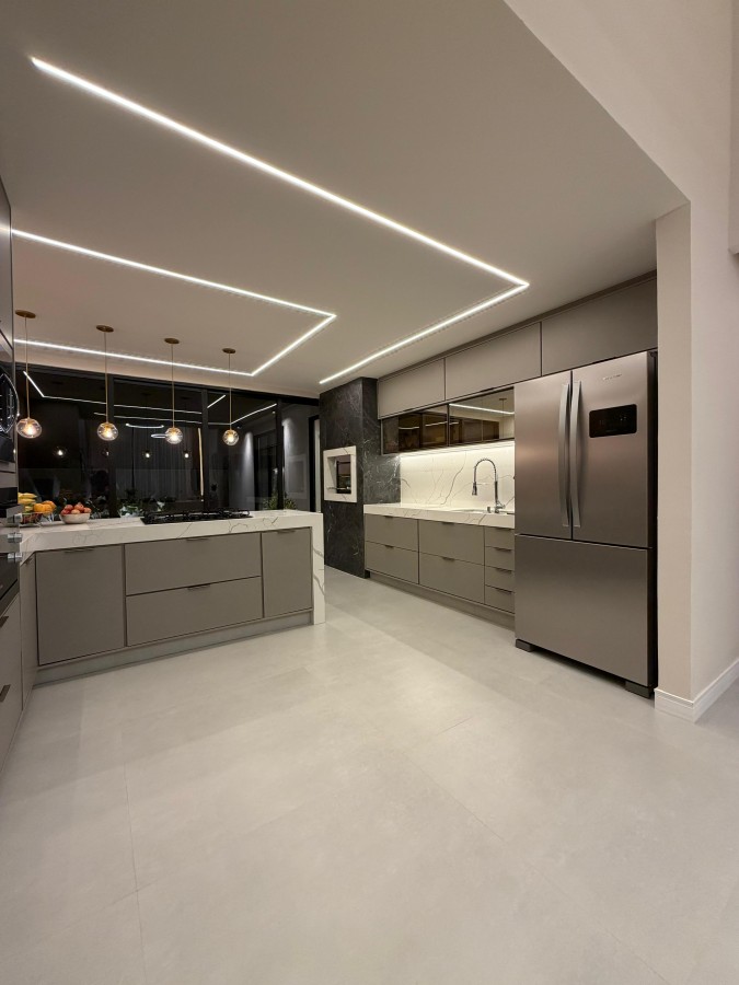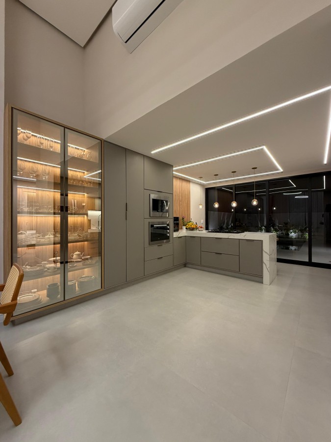 São três quartos, sendo uma suíte com closet e outra suíte adicional, banheiro social, além de uma sala imponente com pé-direito duplo integrada à cozinha gourmet, que traz bancadas em quartzo calacata e móveis planejados.