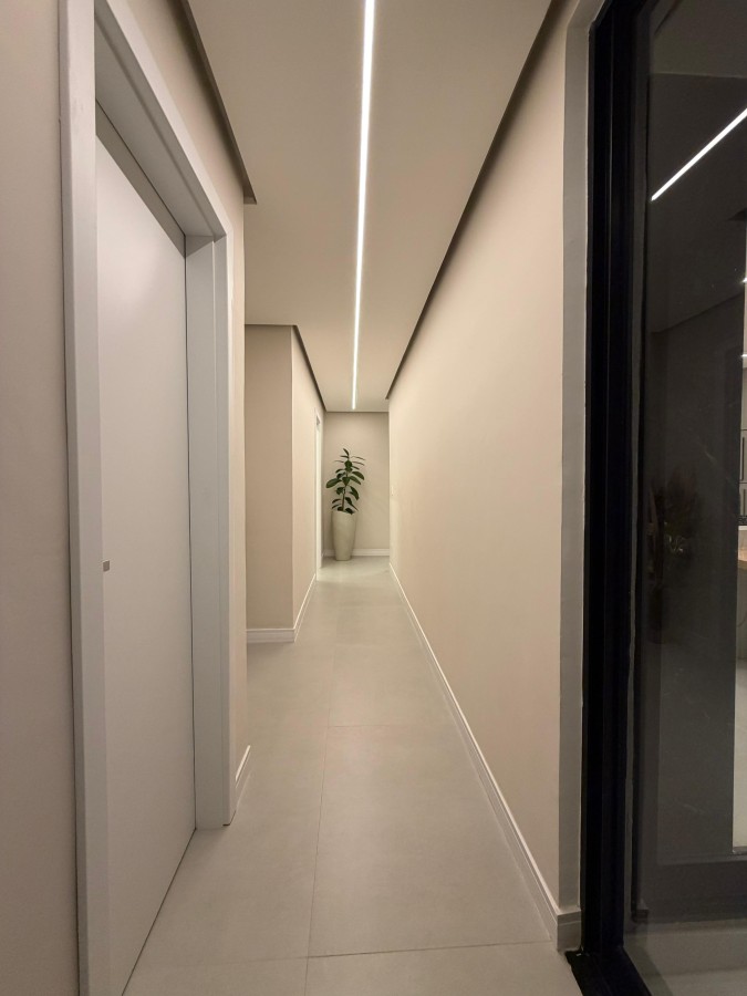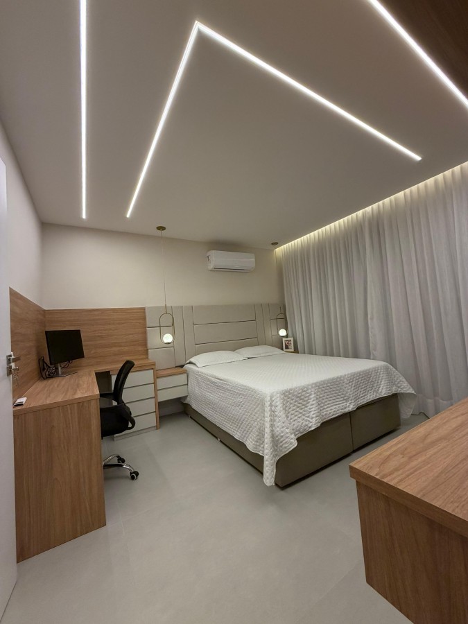 A iluminação toda em LED, com lustre de destaque na sala, realça os ambientes sofisticados, totalmente revestidos em porcelanato.